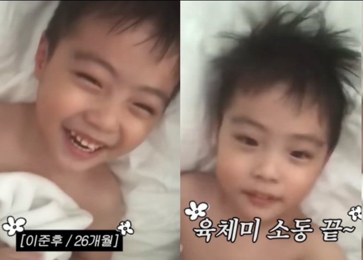 镜头里刚洗完澡的俊厚,与妈妈李珉廷一起躺在床上望向镜头,脸上洋溢着幸福笑容。影片更配上「李俊厚26个月」「洗澡洗得好开心呀」「像妈妈呢?像爸爸呢?」「全世界最幸福的两个人」等暖心字幕。