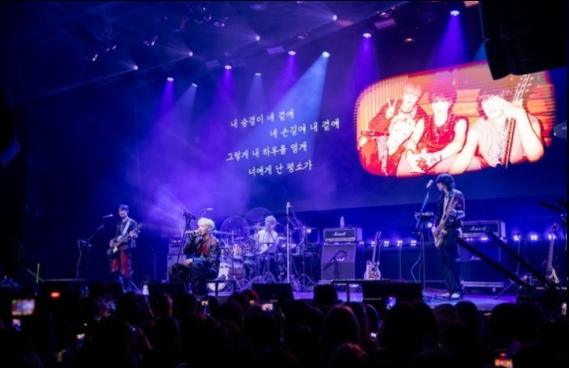 在现场,AxMxP 带来了新专辑的第一首主打歌《PASS》和收录曲《Too Much》,以及去年 9 月发行的出道正规一辑中的《Headbang》。他们以标志性的“嘻哈摇滚”曲风拉开了演出的序幕,现场氛围瞬间点燃。特别是首次公开的《PASS》舞台,凭借爆发性的乐队底噪和成员河柳俊(音译)极具张力的 Rap,赢得了台下热烈的欢呼。